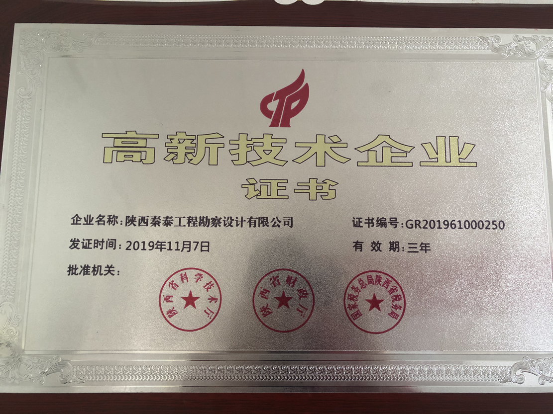 在陜西省2019年第一批高新技術(shù)企業(yè)認(rèn)定中,經(jīng)臨渭區(qū)科技局審核上報(bào),由省科技廳、省財(cái)政廳、省稅務(wù)總局聯(lián)合認(rèn)定,陜西秦泰工程勘察設(shè)計(jì)有限公司入選。證書(shū)編號(hào)GF201961000250。
