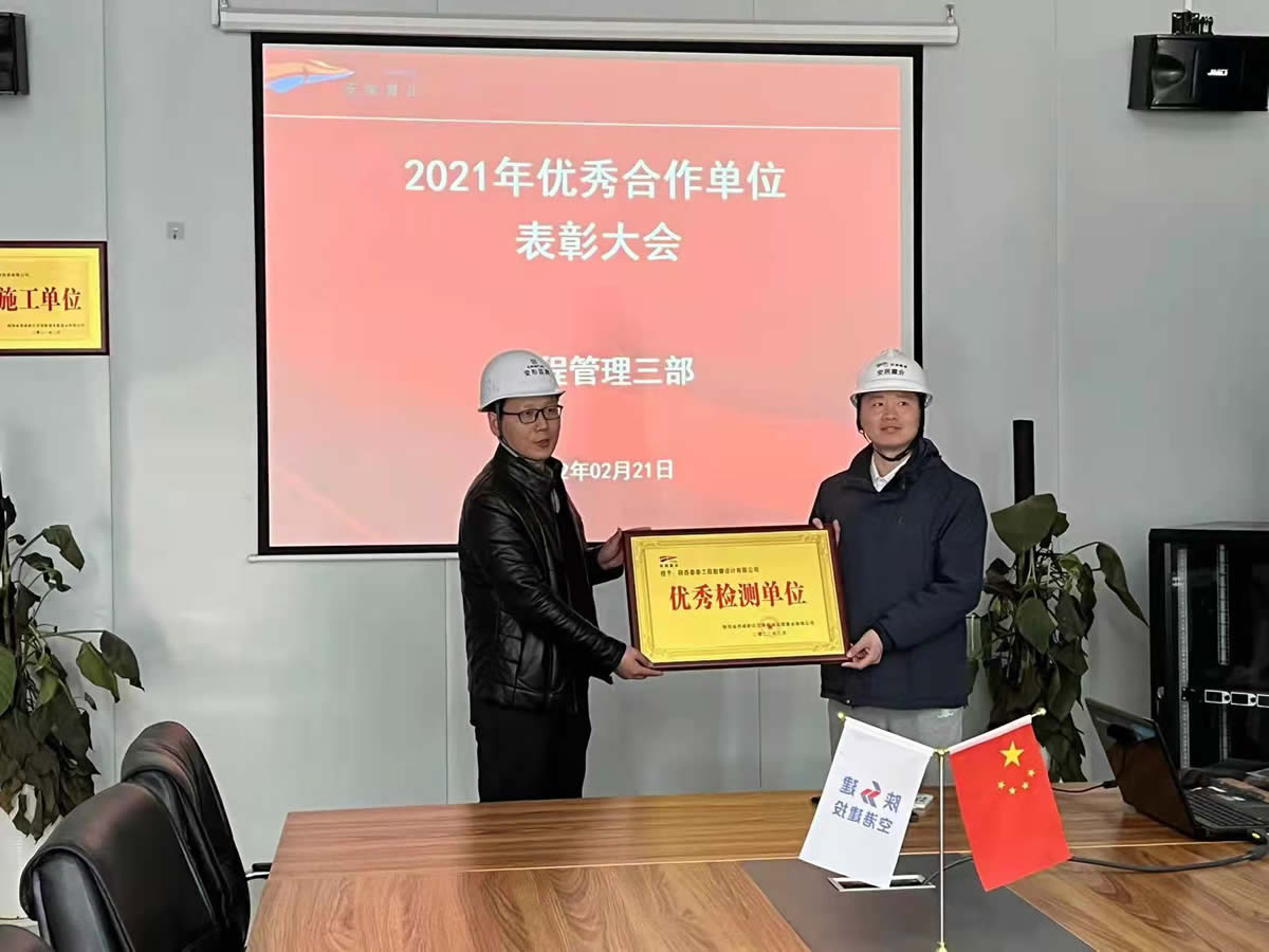 2022年2月21日,陜西省西咸新區(qū)空港新城安居置業(yè)有限公司召開“2021年度優(yōu)秀合作單位表彰大會”,我公司作為合作單位參加會議,并被授予“優(yōu)秀檢測單位”,頒發(fā)獎牌。