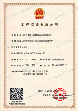 2020年1月1日,經(jīng)陜西省住房和城鄉(xiāng)建設(shè)廳審核批準(zhǔn),陜西秦泰工程勘察設(shè)計(jì)有限公司取得工程監(jiān)理專業(yè)(房屋建筑工程專業(yè)、市政公用工程專業(yè))雙乙級資質(zhì)證書。